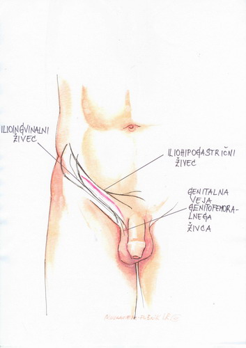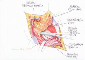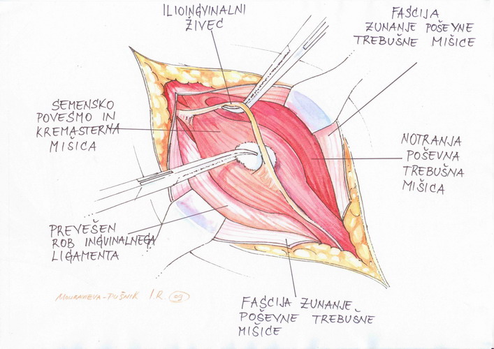 Po zarezanju fascije zunanje poševne trebušne mišice identificiramo ilioingvinalni živec, ki ga največkrat uzremo takoj, ko poteka tik pod fascijo vzdolž semenskega povesma (slika 2). Brez nepotrebnega preprijemanja živca le-tega s škarjami ali topo odprepariramo od podlage ter odmaknemo lateralno, medialno od njega zapnemo na fascijo (ingvinalni ligament) pean ter živec do konca posega tako retiniramo v položaju.