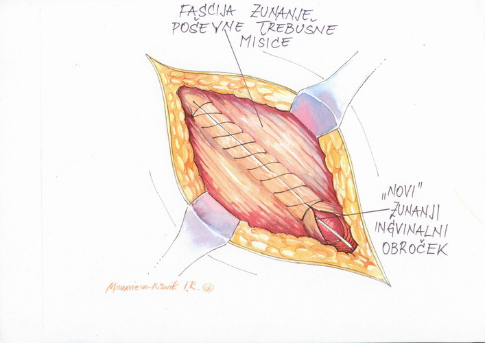 S kakršnimkoli šivom (navadno resorbtivnim 2/0 ali 3/0) sešijemo oba lista aponevroze zunanje poševne trebušne mišice, pred tem pod njiju položimo semensko povesmo in ilioingvinalni živec (vzpostavljena prvotna anatomska lega). Distalni krn kremastrne mišice všijemo na aponevrozo s spodnje strani (lahko z istim šivom, s katerim zapiramo aponevrozo), s čimer preprečimo povešenje moda na operirani strani (slikI 10 in 11).