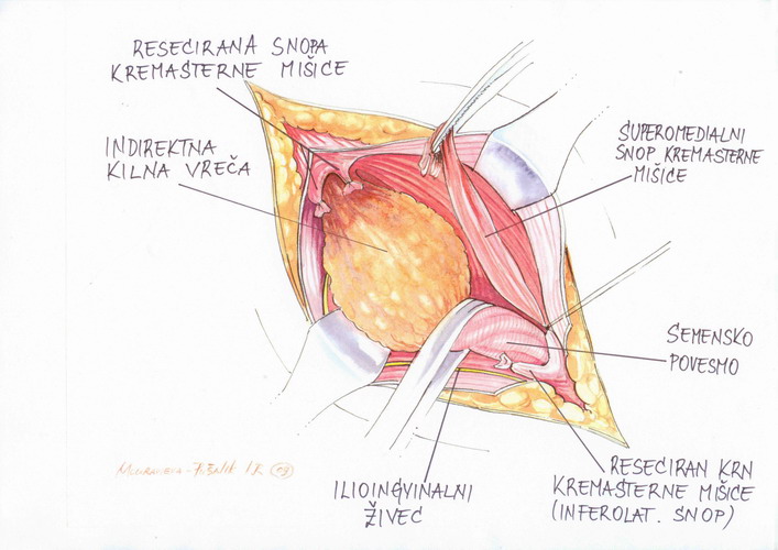 Ob notranjem dimeljskem obročku pograbimo v šiv še proksimalni krn odreseciranega kremastra ter ga potegnemo pod notranjo poševno trebušno mišico.