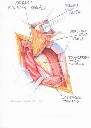 V primeru indirektne kile sprepariramo kilno vrečo globoko do notranjega obročka, tako da se nam ob njem odpre preperitonealni (oz. t. i. Bogrosov) prostor (slika 4).