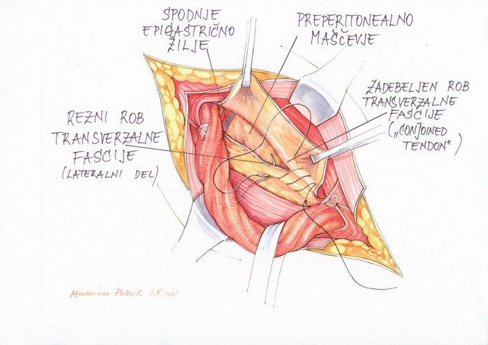 Incidiramo fascijo transverzalis (začnemo s skalpelom ali kutorjem medialno pri pubičnem tuberklu) ter nadaljujemo s kutorjem ali Metzenbaumovimi topimi škarjami proti notranjemu ingvinalnemu obročku ter se ustavimo pred epigastričnim žiljem. Le-to redko poteka tako, da moti kasnejšo hernioplastiko, saj ga lahko odmaknemo dorzalno. Če vendarle moti, ga odreseciramo med ligaturama. Nekateri avtorji svetujejo obratno smer rezanja transverzalne fascije (6). Med prekinitvijo transverzalne fascije se preperitonealno maščevje prične bočiti v operativno polje, lateralno se dorzalno od ingvinalnega ligamenta pokaže Cooperjev ligament (slika 6).