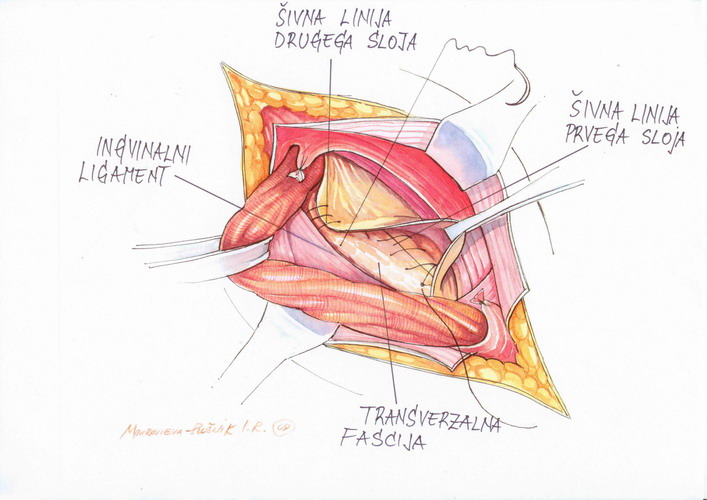 Nato tekoče pošijemo €“ zbližamo prerezano transverzalno fascijo v smeri proti lateralno do notranjega dimeljskega obročka. Na medialni strani šivamo t.i. »belo črto« oz. spodnjo ploskev združene tetive (»conjoined tendon«), ki skrajno medialno in kavdalno predstavlja lateralni rob ovojnice preme trebušne mišice, bolj kranialno skupno tetivo prečne trebušne mišice in notranje poševne trebušne mišice, še bolj lateralno pa postane mišična struktura. Na lateralni strani predstavlja rob šivne linije iliopubični trakt.