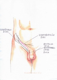 Med operacijo moramo v dimeljskem kanalu identificirati vsaj dva kožna živca (slika 1): ilioingvinalni živec (oživčenje kože skrotuma oz. velikih labijev) poteka lateralno od povesma, zato ga navadno odmaknemo lateralno. Če je kljub temu napoti, ga odreseciramo. V tem primeru je namreč boljša delna omrtvičenost kože kot nevralgija. Medialno od semenskega povesma potekajoči iliohipogastrični živec (oživčuje kožo hipogastrija) največkrat ne moti pristopa do operativnega polja. Če je napoti, ga odmaknemo medialno. Važno je, da nobenega od živcev med hernioplastiko ne ujamemo v šiv ali kako drugače stisnemo, ker lahko to povzroči nevralgijo. Tretji živec dimeljskega kanala je genitalna veja genitofemoralnega živca, ki oživčuje kremastrno mišico in delno tudi kožo skrotuma oz. velikih labijev). Navadno poteka v globini semenskega povesma in jo redko poškodujemo.