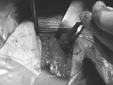 69-letni moški je v stoječem položaju približno dve leti opažal dva centimetra veliko kilo, ki se je postopno večala in ga pričela ovirati pri vsakdanjih opravilih (Sl. 2). Prej so mu odstranili slepič, zato smo najprej pomislili na pooperativno kilo, ki pa je po apendektomiji redka (0,12 %) (2). Zaradi klinično očitne kile slikovnih diagnostičnih preiskav nismo opravljali. Pri operaciji smo ugotovili defekt trebušne stene z razmaknjenimi vitrami fascije v področju Spigelijeve polkrožne črte. Mesto je bilo nekaj centimetrov bolj medialno od brazgotine po apendektomiji, zato smo z gotovostjo izključili pojav pooperativne kile. V defektu trebušne stene je bila najdena kilna vreča, v kateri je bilo preperitonealno maščevje (Sl. 3). Po repoziciji kile v trebušno votlino smo naredili hernioplastiko s polipropilensko mrežico, ki smo jo vstavili preperitonealno in pritrdili s posameznimi šivi. Preko mrežice smo zašili duplikaturo fascije zunanje poševne trebušne mišice (musculus obliquus externus abdominis). Razen manjšega podkožnega hematoma, ki se je resorbiral spontano, je bil pooperativni potek gladek.